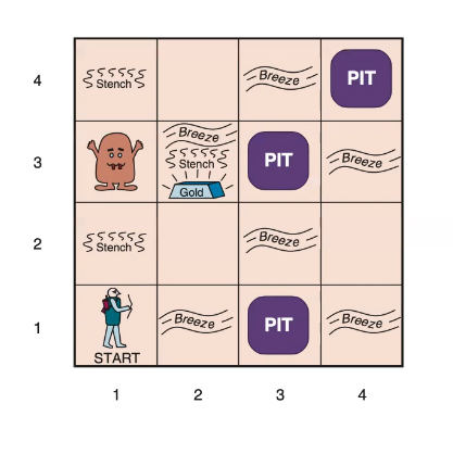 We as humans can reason about this environment and the rules, even if we didn’t have all the information. For example, if we were in a square with stench, we’d know Wumpus is in one of the adjacent squares. If we go to square (1, 2) for example, Wumpus must be in (1,3) or (2,2). Then we could go down and to the right to (2,1). We’d notice a breeze. So either (3,1) or (2,2) is a pit. However, as humans we can see the connection that since there was no breeze in (1,2), (2,2) cannot be a pit. We also see that since (2,1) is not smelly, Wumpus cannot be in (2,2) so now we know that (2,2) is actually safe.