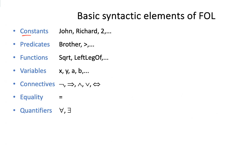 - Intended interpretation - if you use the constant symbol John it refers to John, you don’t use Steve to refer to the object named John (cuz it’d be confusing)
