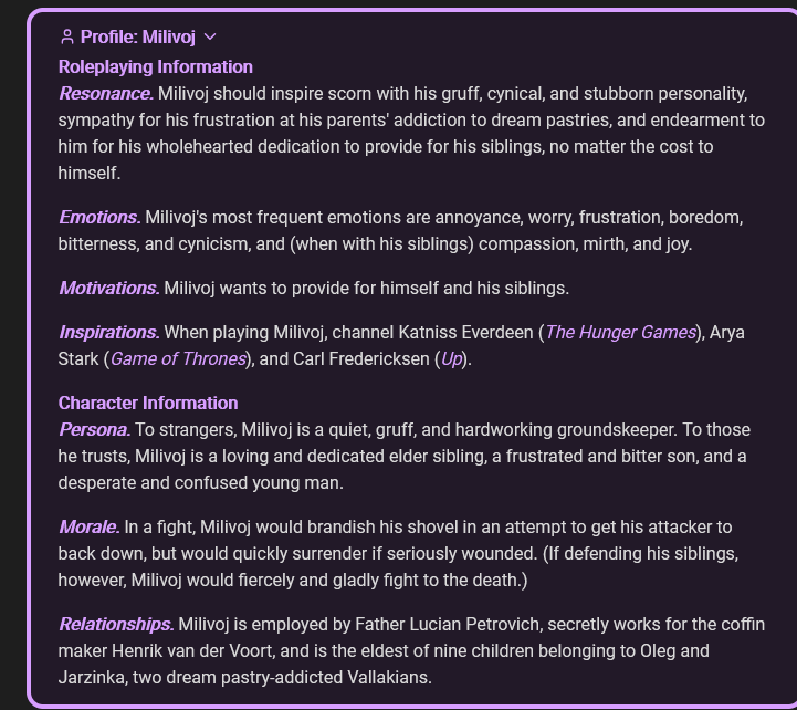 If he is later informed that Henrik’s actions were directed by one of Strahd’s vampire spawn, and that the theft of the bones could have allowed a slaughter at the church, Milivoj is overcome with anxiety, horror, and guilt. He prostrates himself before Father Lucian and begs for his forgiveness, offering to exile himself to the Svalich Woods if doing so will make up for the harm he has caused. (Father Lucian, of course, declines, tearfully embracing and forgiving Milivoj instead.)