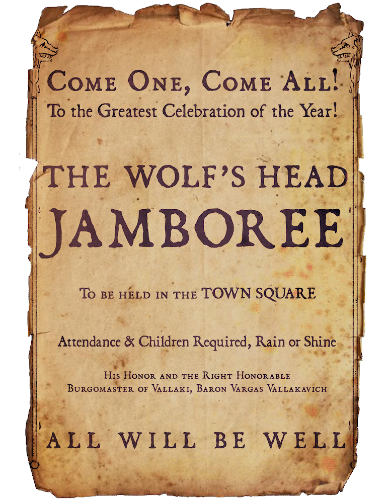 The town square shows some signs of life. There’s people all around, some going in and out of various shops and houses. There’s stalls that appear to have been possibly for a farmers market at one point, although they are long abandoned and mostly falling apart. You see remnants of banners and confetti littered around. All around various posts you can see posters saying The Wolf’s Head Jamboree. Some kids are playing with toys near a tree while their parents watch from a nearby bench.