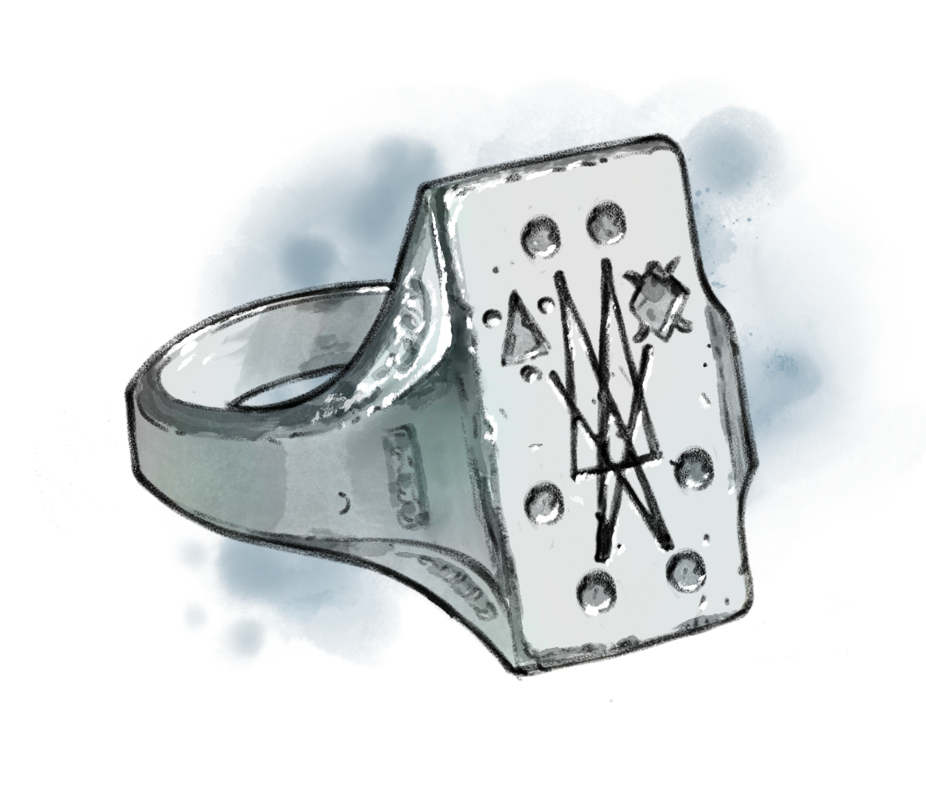 The symbol on the signet ring resembles the connected series of lines depicted on V2. Tower Door (p. 169), but rotated counterclockwise such that the shape is vertically symmetrical. A tiny arcane rune has been carved into the metal above each of the two unconnected ends of the series of lines.