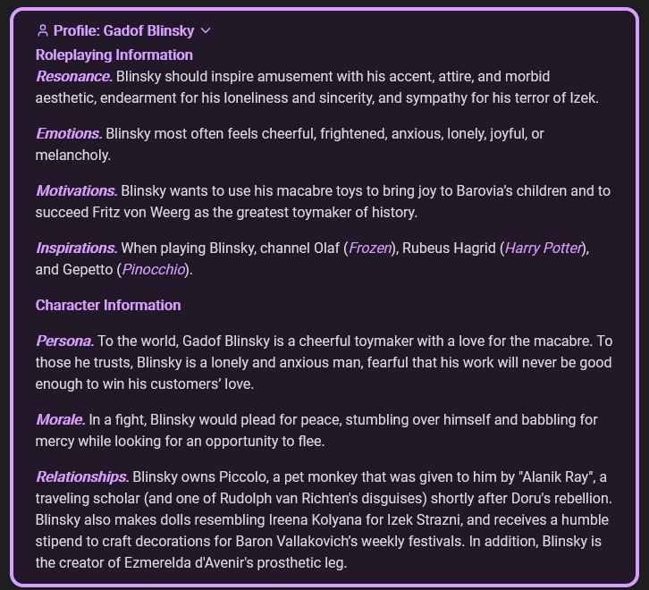 - Blinsky makes special dolls for the burgomaster’s henchman, Izek Strazni (see area N3 and appendix D). Izek doesn’t pay for the dolls but instead threatens to burn down Blinsky’s shop unless the toymaker delivers a new doll every month. Every doll is modeled on a description given to Blinsky by Izek, and each doll has been closer to capturing Ireena’s likeness than the last. file:///C:/Users/Matthew%20Gardner/Downloads/413410-d100_Blinsky_Toys.pdf As the characters explore the shop, Blinsky cheerfully tells them about his inspiration for making toys: the legendary toymaker Fritz von Weerg, and his greatest invention that was lost to the ages: a clockwork man said to lie somewhere in Castle Ravenloft.